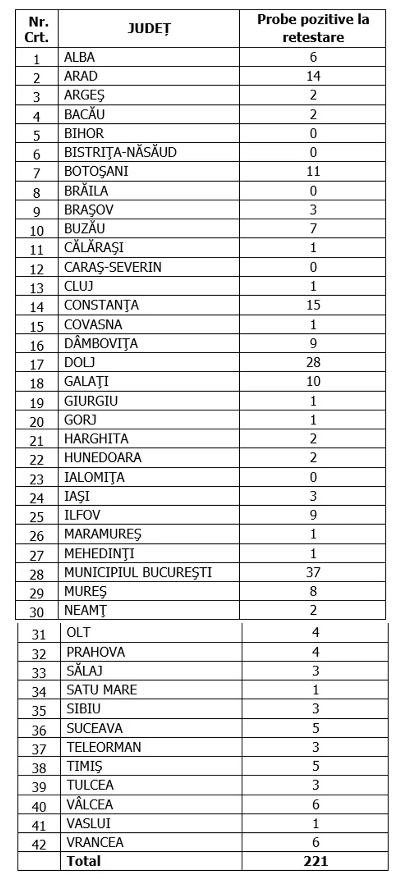 Distinct de cazurile nou confirmate, în urma retestării pacienților care erau deja pozitivi, 221 de persoane au fost reconfirmate pozitiv.