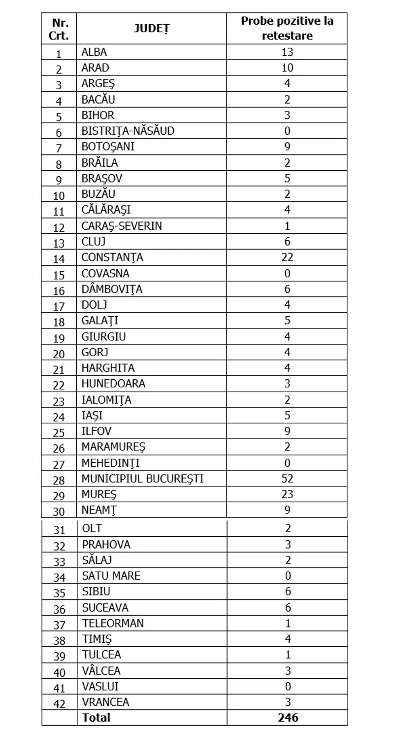 Distinct de cazurile nou confirmate, în urma retestării pacienților care erau deja pozitivi, 246 de persoane au fost reconfirmate pozitiv.