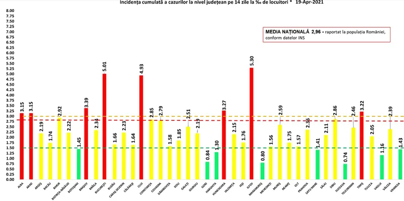 Coeficientul infectărilor cumulate la 14 zile, raportate la 1.000 de locuitori este calculat de către Direcțiile de Sănătate Publică, la nivelul Municipiului București și al județelor. Mai jos aveți graficul realizat în baza raportărilor primite de CNCCI de la Direcțiile de Sănătate Publică: