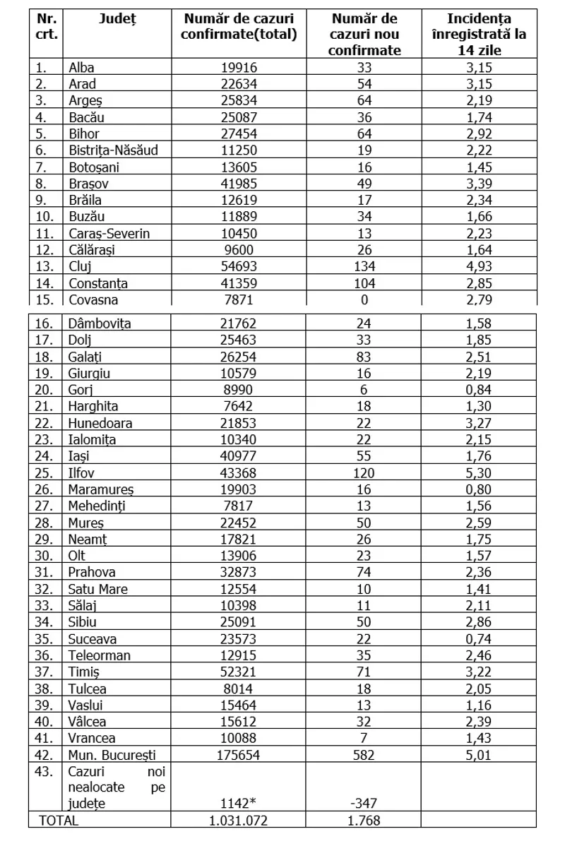 În total, în România au fost confirmate 1.031.072 de cazuri de infectare cu coronavirus, iar 26.381 de oameni infectați au murit.