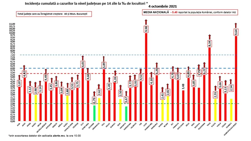 Coeficientul infectărilor cumulate la 14 zile, raportate la 1.000 de locuitori este calculat de către Direcțiile de Sănătate Publică, la nivelul Municipiului București și al județelor. Mai jos aveți graficul realizat în baza raportărilor primite de CNCCI de la Direcțiile de Sănătate Publică: