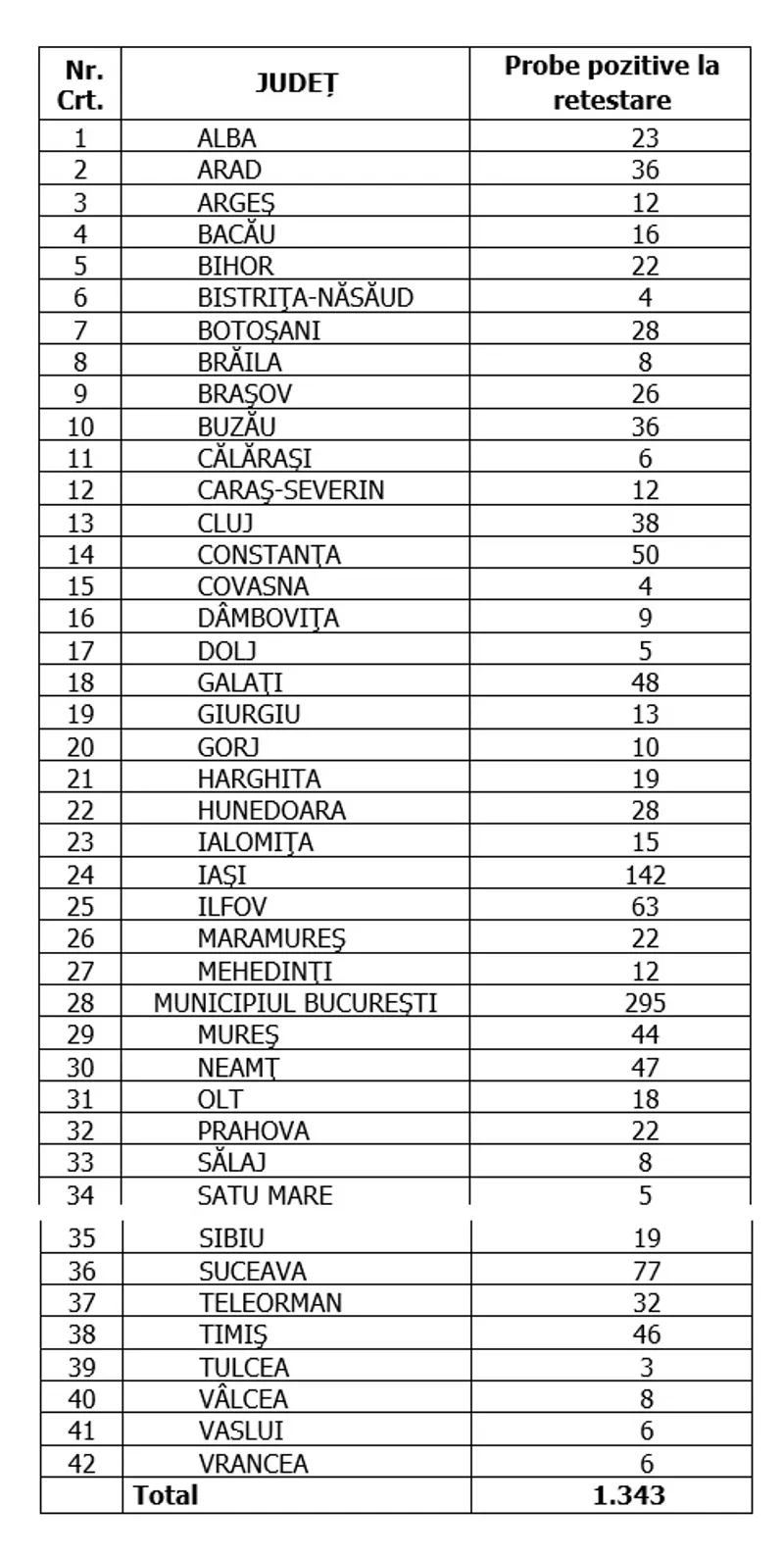 Distinct de cazurile nou confirmate, în urma retestării pacienților care erau deja pozitivi, 1.343 de persoane au fost reconfirmate pozitiv. Distribuția pe județe a acestor cazuri o regăsiți în tabelul de mai jos: