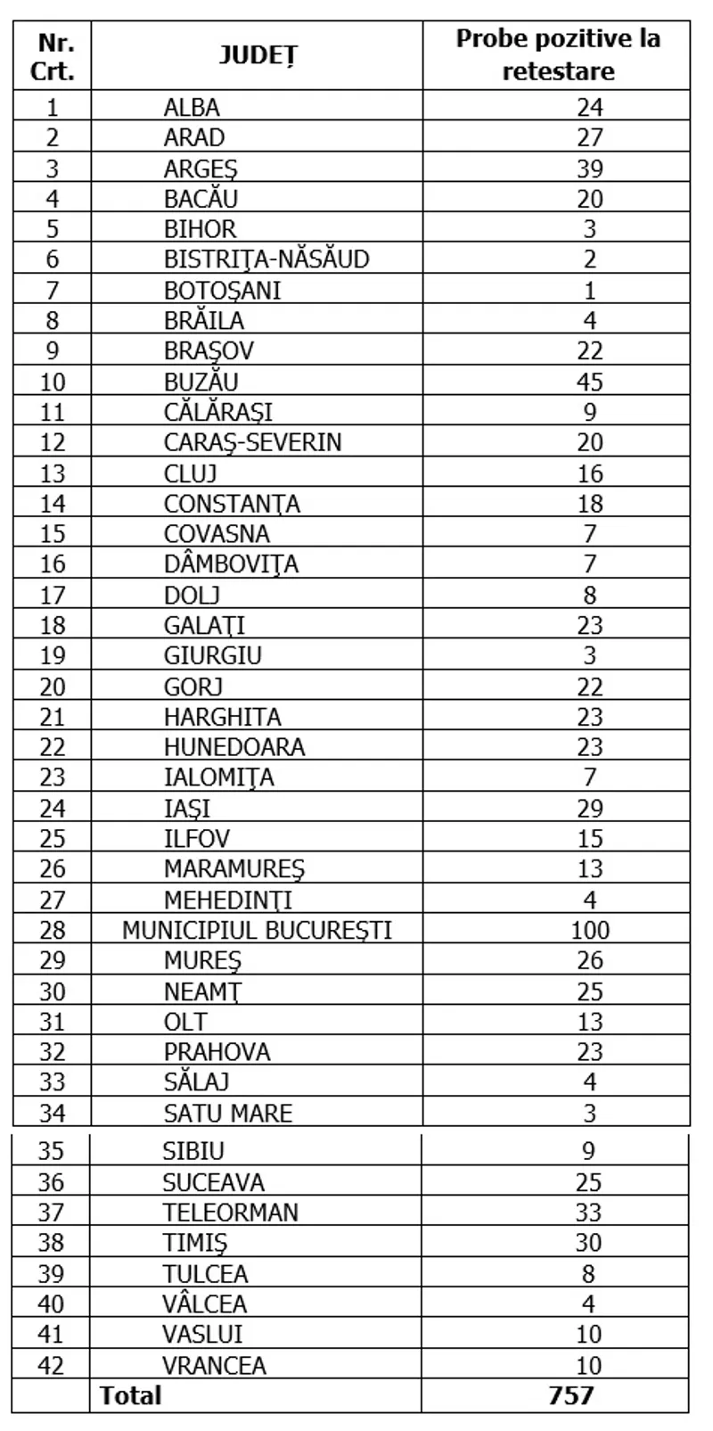 Distinct de cazurile nou confirmate, în urma retestării pacienților care erau deja pozitivi, 757 de persoane au fost reconfirmate pozitiv. Distribuția pe județe a acestor cazuri o regăsiți în tabelul de mai jos: