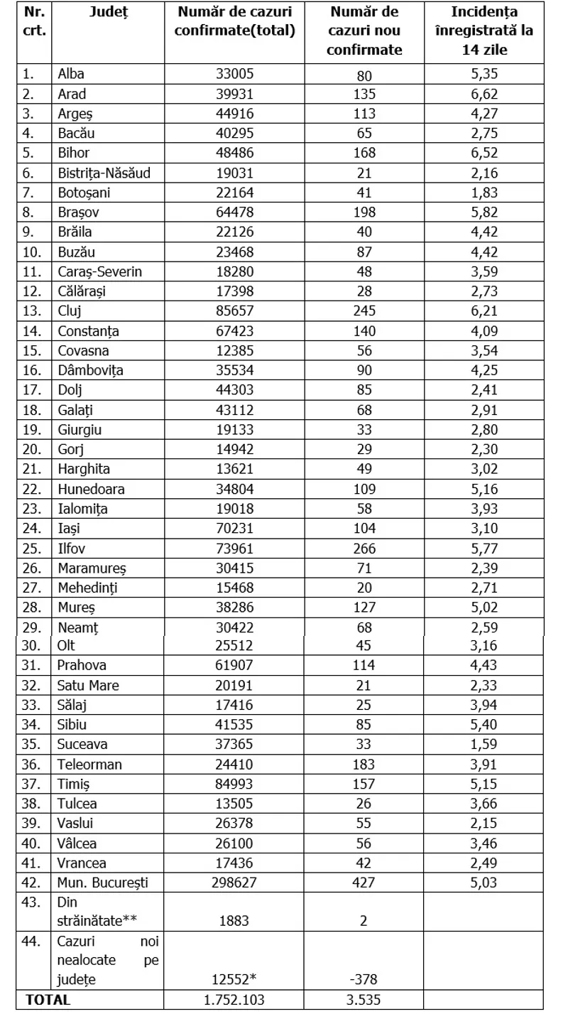 Distribuția pe județe a cazurilor per total și a celor noi o regăsiți în tabelul de mai jos: