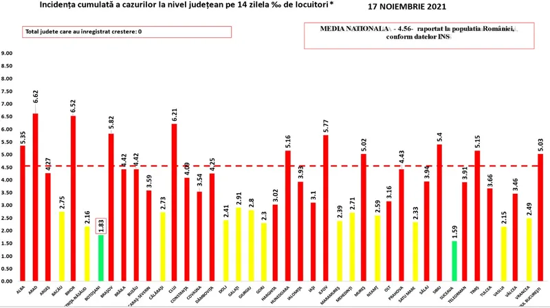 Coeficientul infectărilor cumulate la 14 zile, raportate la 1.000 de locuitori este calculat de către Direcțiile de Sănătate Publică, la nivelul Municipiului București și al județelor. Mai jos aveți graficul realizat în baza raportărilor primite de CNCCI de la Direcțiile de Sănătate Publică: