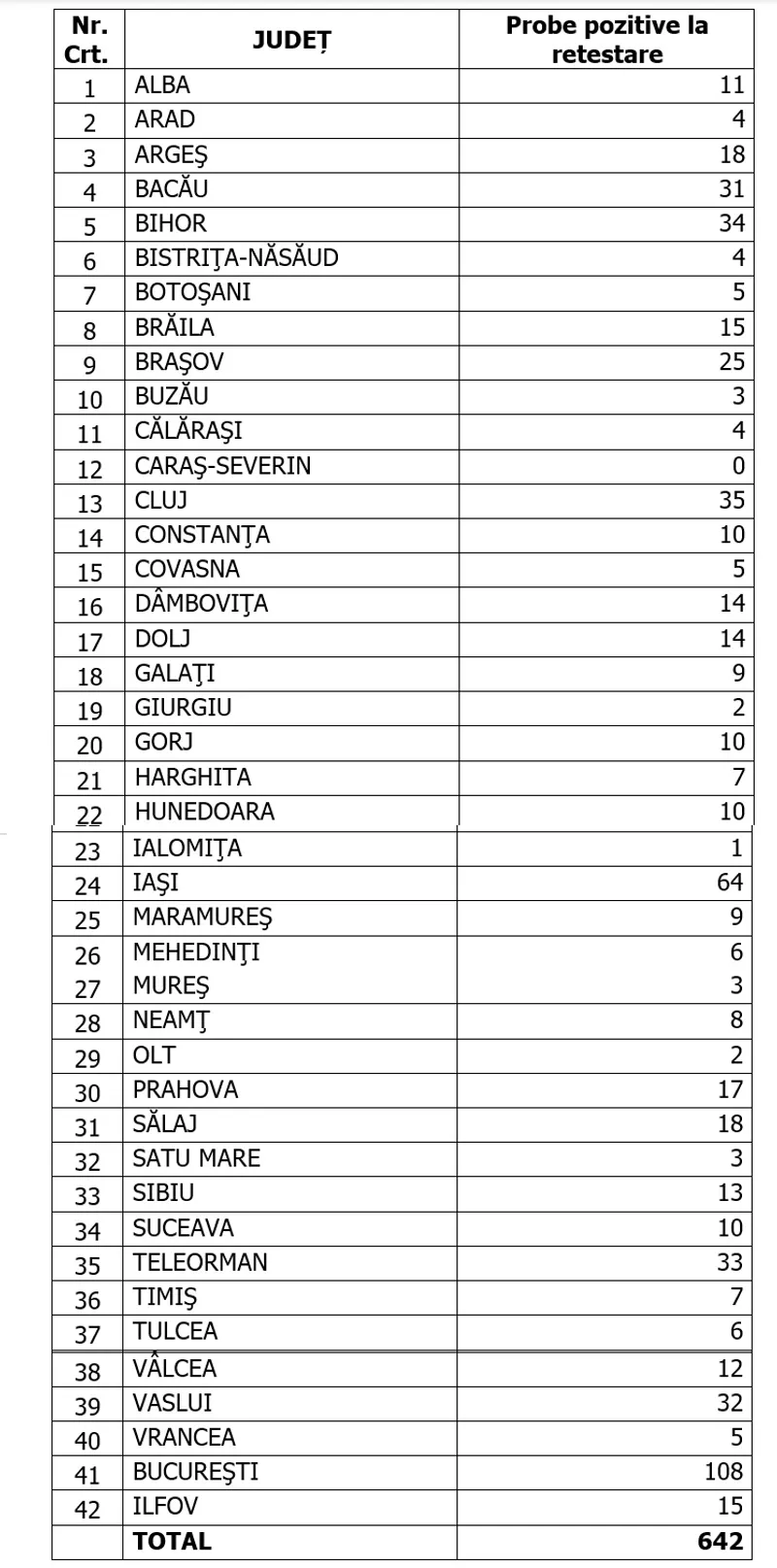 Distinct de cazurile nou confirmate, în urma retestării pacienților care erau deja pozitivi, 642 de persoane au fost reconfirmate pozitiv.