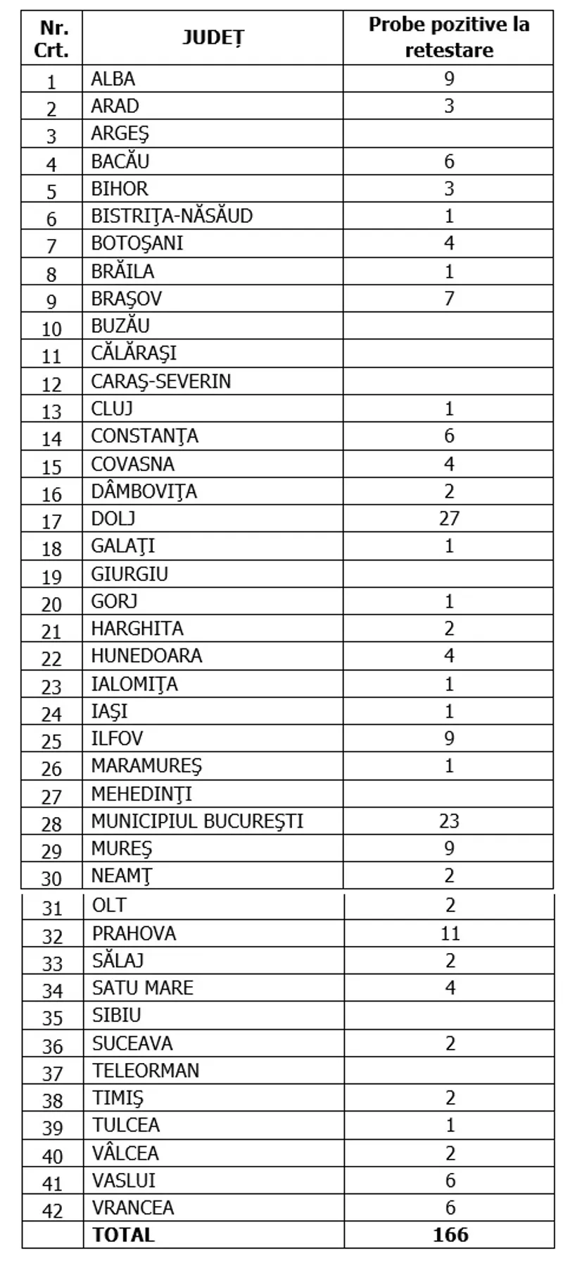 Distinct de cazurile nou confirmate, în urma retestării pacienților care erau deja pozitivi, 166 de persoane au fost reconfirmate pozitiv.