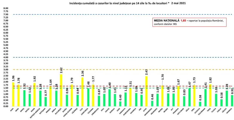 Coeficientul infectărilor cumulate la 14 zile, raportate la 1.000 de locuitori este calculat de către Direcțiile de Sănătate Publică, la nivelul Municipiului București și al județelor. Mai jos aveți graficul realizat în baza raportărilor primite de CNCCI de la Direcțiile de Sănătate Publică: