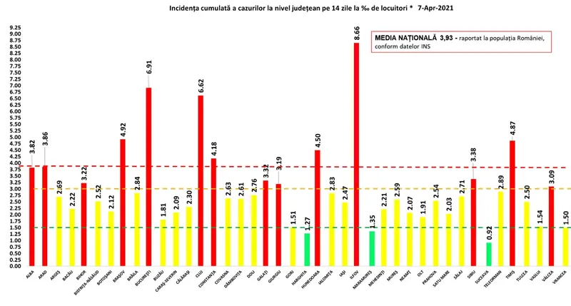 Coeficientul infectărilor cumulate la 14 zile, raportate la 1.000 de locuitori este calculat de către Direcțiile de Sănătate Publică, la nivelul Municipiului București și al județelor. Mai jos aveți graficul realizat în baza raportărilor primite de CNCCI de la Direcțiile de Sănătate Publică: