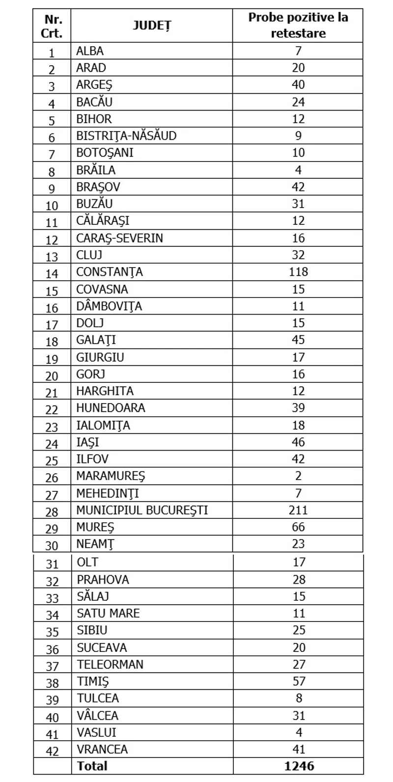 Distinct de cazurile nou confirmate, în urma retestării pacienților care erau deja pozitivi, 1.246 de persoane au fost reconfirmate pozitiv.