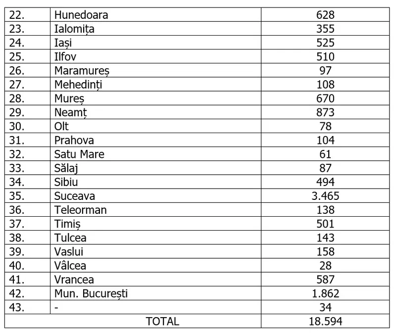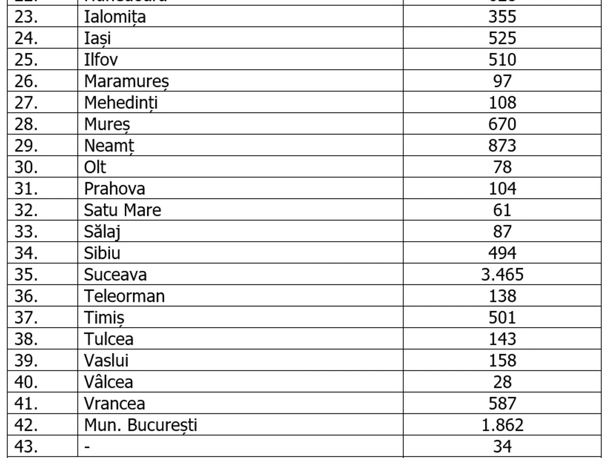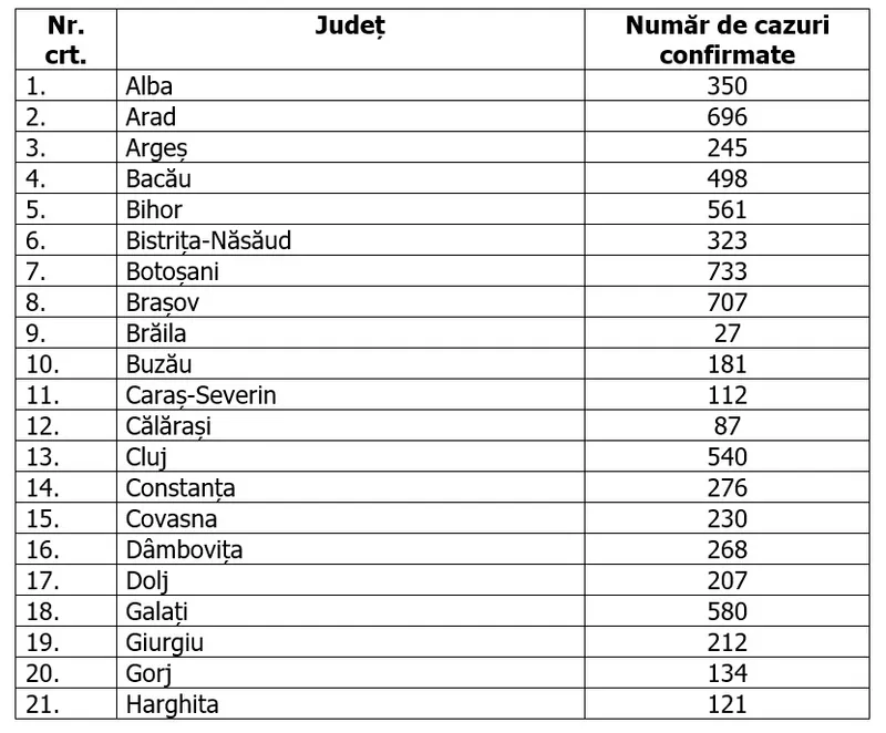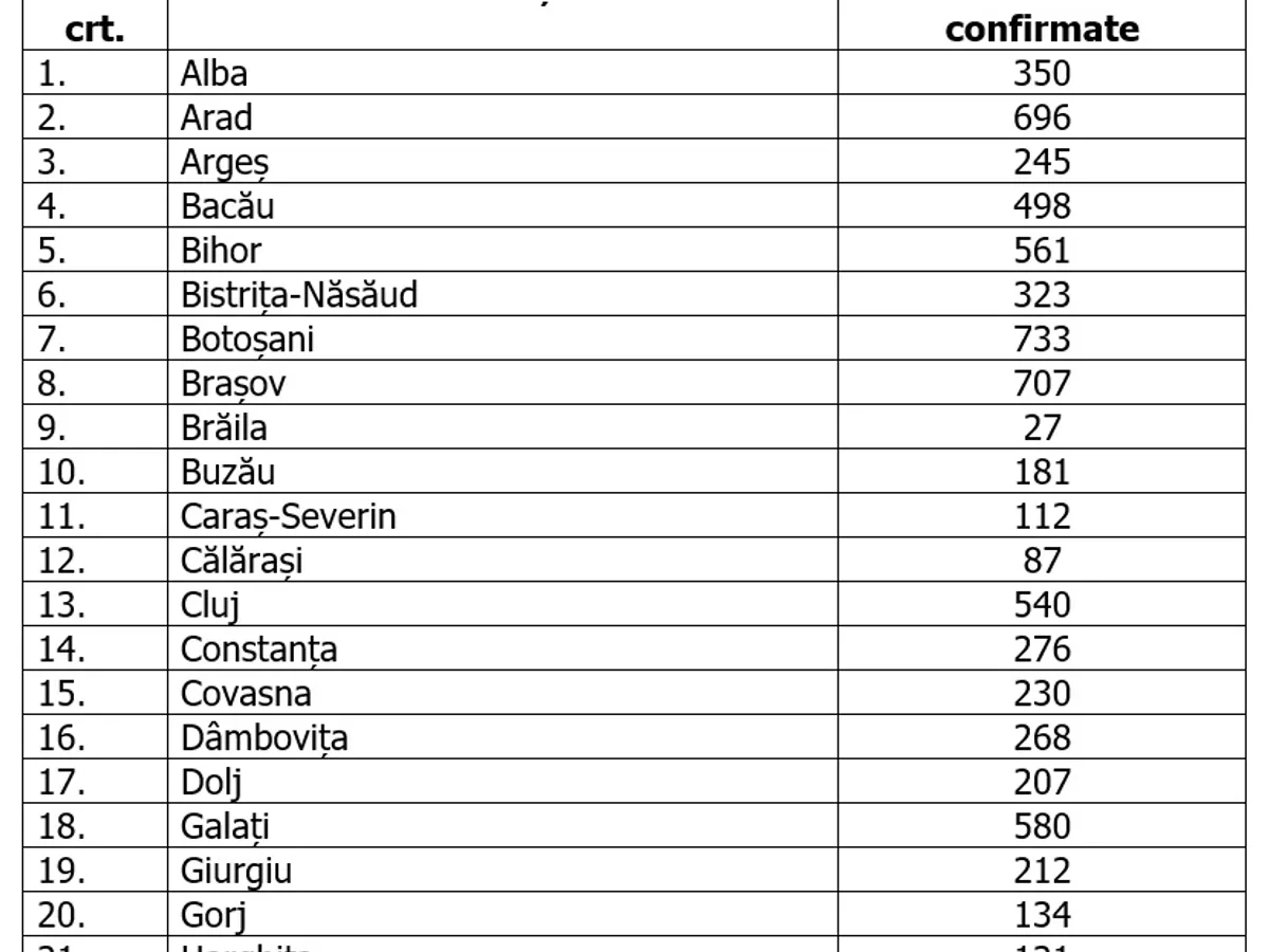 Numărul de cazuri confirmate, pe județe, potrivit raportării Institutului Național de Sănătate Publică: