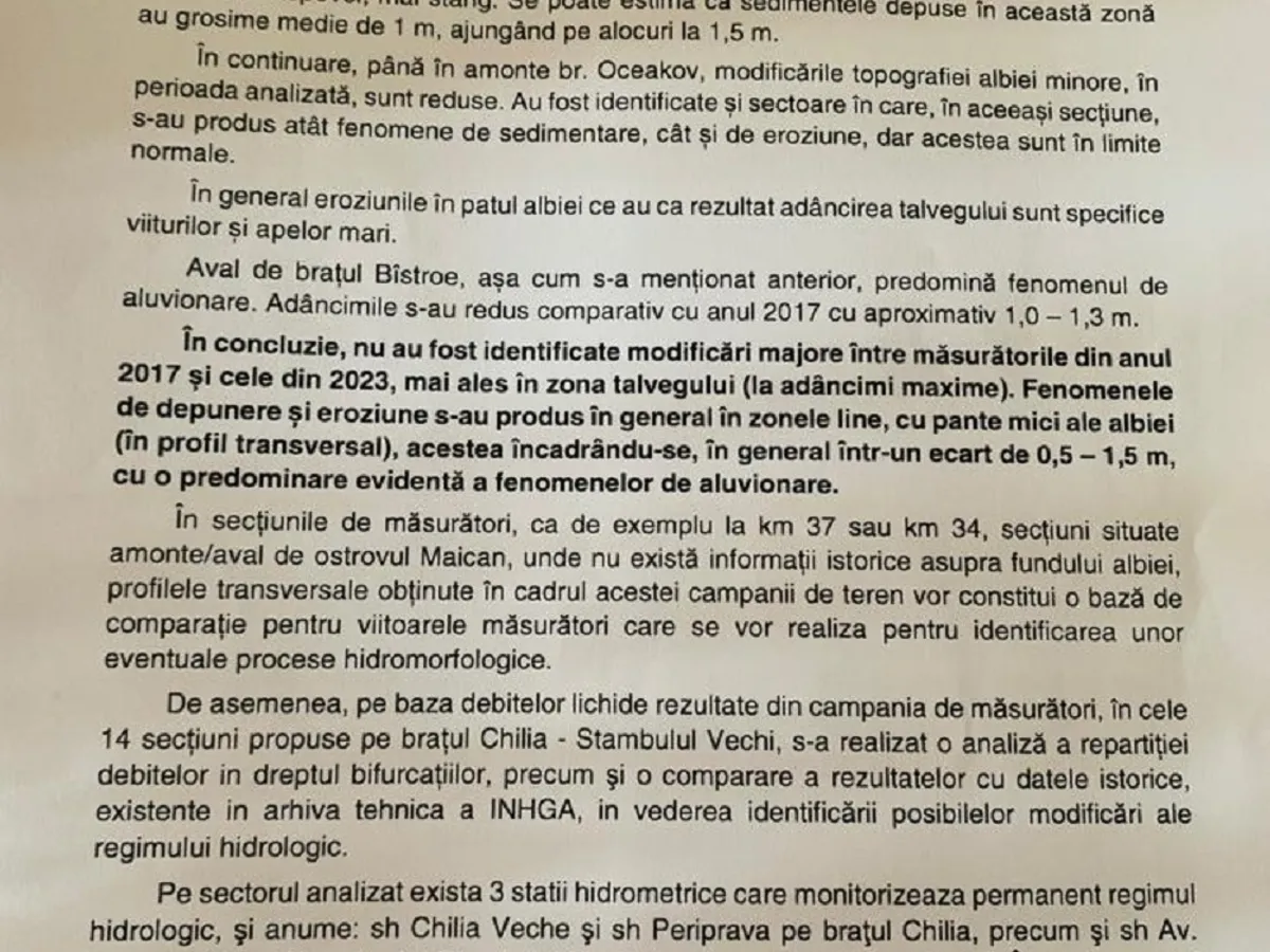 Apele Române au măsurat deja debitele pe brațele Chilia și Bîstroe, și nu au găsit „modificări semnificative”. „Nu au fost înregistrate modificări majore între măsurătorile din anul 2017 și cele din 2023”, iar „repartiția debitelor pe Brațul Chilia (aval Periprava) și brațele secundare Oceakov și Bîstroe poate fi încadrată ca o situație normală”, este concluzia documentelor consultate.