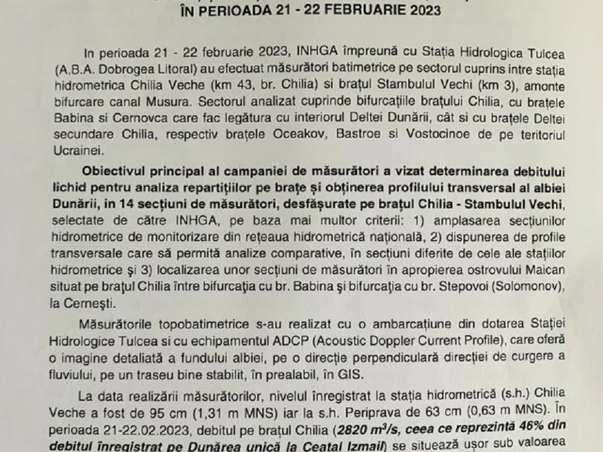 „În perioada 21- 22 februarie 2023, Institutul Național de Hidrologie și Gospodările a Apelor (INGHA), împreună cu Stația Hidrologică Tulcea (ABA Dobrogea Litoral) au efectuat măsurători batimetrice pe sectorul cuprins între stația hidrometrică Chilia Veche (km 43, brațul Chilia) și brațul Stambulul Vechi (km 3)”, precizează documente intrate în posesia Newsweek România.