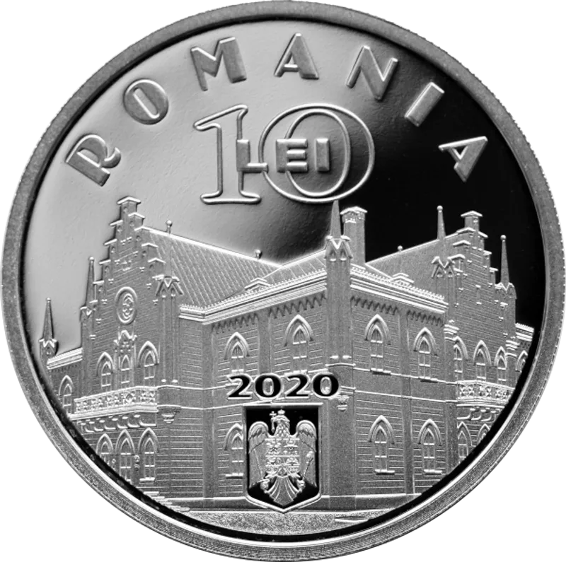 Aversul monedei din argint redă imaginea Palatului "Alexandru Ioan Cuza" de la Ruginoasa, inscripţia în arc de cerc "ROMANIA", valoarea nominală "10 LEI", stema României şi anul de emisiune "2020".
