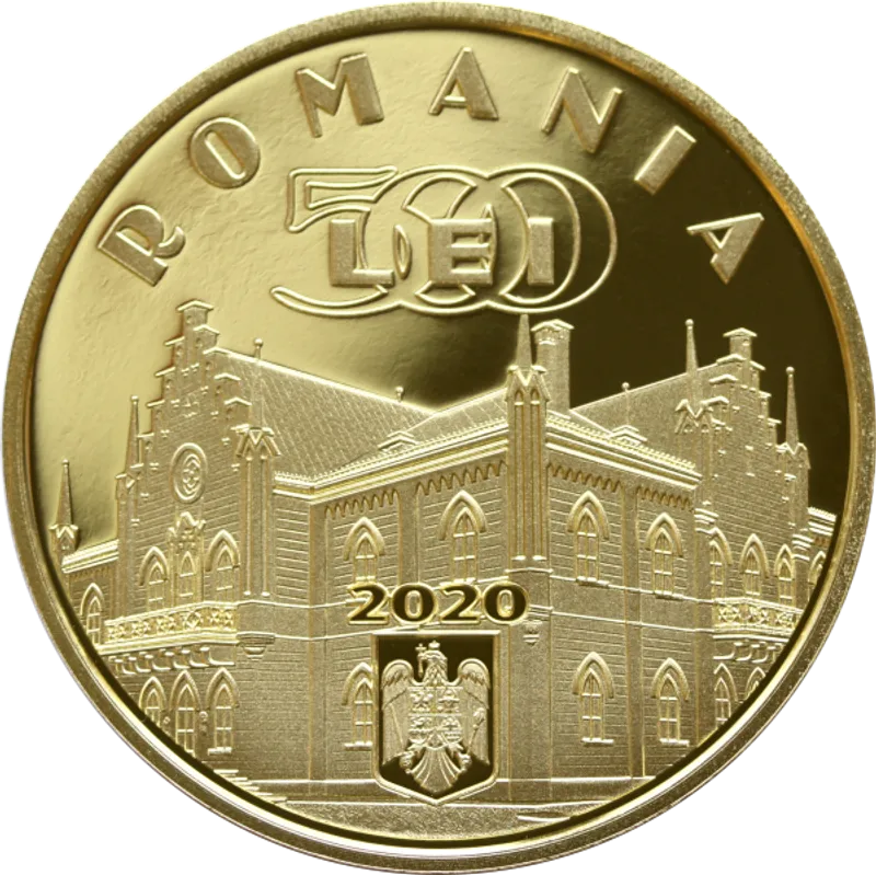 Aversul monedei din aur redă imaginea Palatului "Alexandru Ioan Cuza" de la Ruginoasa, inscripţia în arc de cerc "ROMANIA", valoarea nominală "500 LEI", stema României şi anul de emisiune "2020".