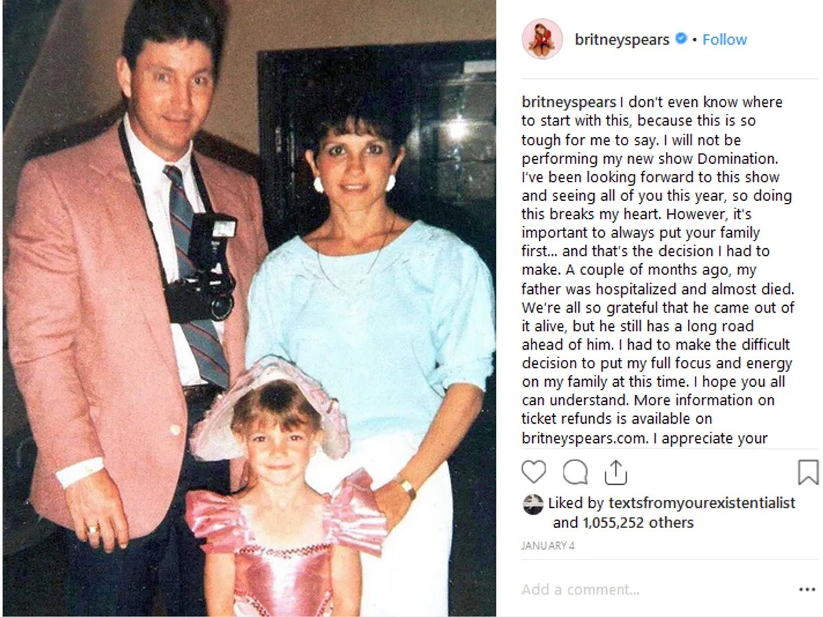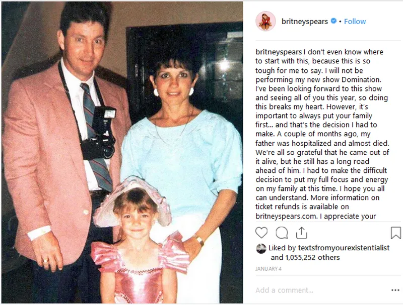 Britney a postat un mesaj pe contul său de Instagram pe data de 4 ianuarie în care anunța că își anulează un concert și că trebuie să își pună familia pe primul loc.