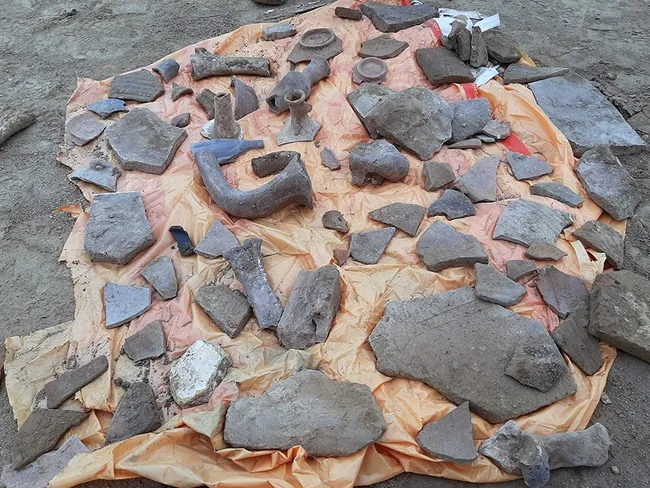 „Văd că avem un unguentariu de epocă romană, secolele II-III, e posibil chiar IV. Este și ceramică elenistică. Ieri, când am fost, am găsit și un femur uman, este posibil să fi fost un mormânt. Într-adevăr, mă surprinde câtă ceramică elenistică este aici. Răul este făcut în sensul că acum nu este fezabil să iei la mână, la cernut, atâtea tone de pământ. Dar, într-adevăr, aici este mai mult decât ceea ce am găsit noi ieri. Fragmentele astea sunt din secolele III-II î.H.