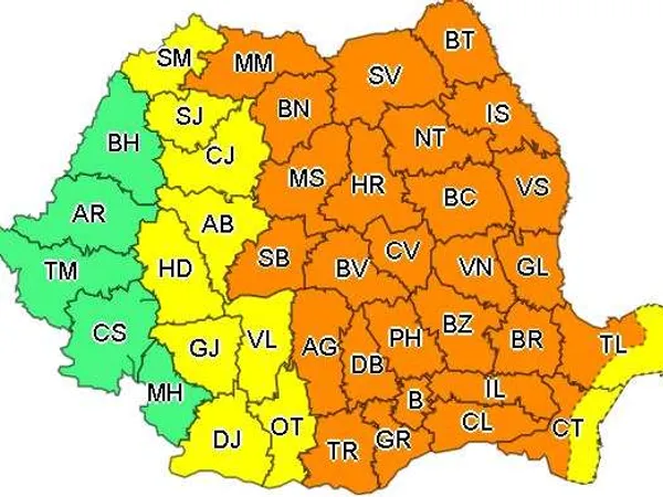 Alături de Capitală, judeţele marcate cu Cod portocaliu sunt Maramureş, Bistriţa-Năsăud, Suceava, Botoşani, Iaşi, Neamţ, Harghita, Mureş, Sibiu, Braşov, Covasna, Bacău, Vaslui, Galaţi, Vrancea, Buzău, Prahova, Dâmboviţa, Argeş, Teleorman, Giurgiu, Ilfov, Călăraşi, Ialomiţa, Brăila, Tulcea (parţial) şi Constanţa (parţial).
