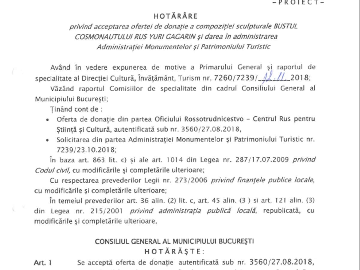 Donația a fost făcută în luna august, dar Primăria Generală a Municipiului București a supus spre aprobare o hotărâre de acceptare a donației săptămâna aceasta.
