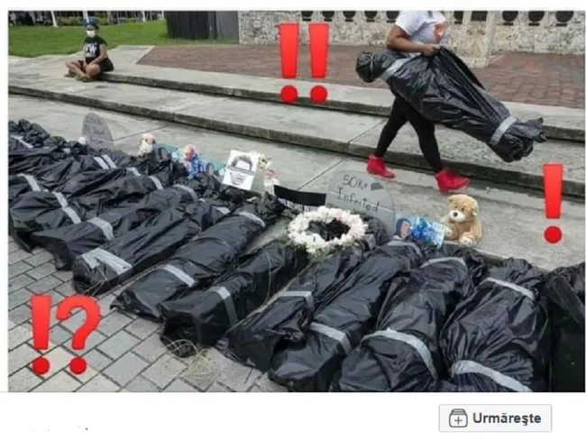 O imagine cu niște saci în care se presupune că ar fi cadavre ale unor persoane infectate cu COIVD -19 are mii de share-uri pentru a demonstra că pandemia este, de fapt, o conspirație. În imagine se vede cum un bărbat plimbă cu prea mare ușurință un astfel de sac.
