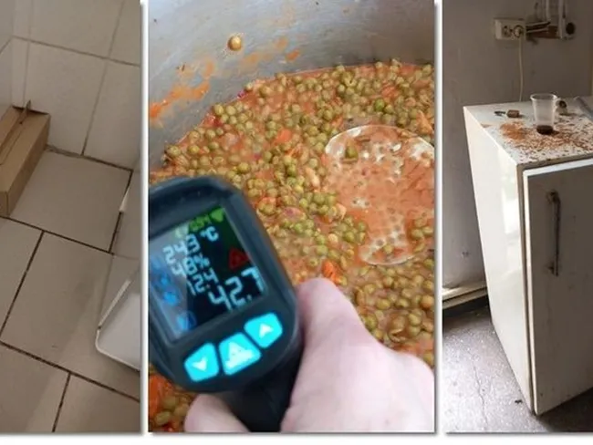 ”Abateri constatate: agregate frig neigenizate, cu depuneri masive de praf şi cu urme de mucegai; nu se monitorizează temperatura complet la spaţiile frig din dotare; peretele exterior vitrat prezenta în partea de jos exfoliere de zugrăveală, iar tocăria din fier cornier nu a mai fost igienizată, prezentând pe porţiuni extinse rugină, iar unele geamuri erau sparte, ciobite şi neînlocuite; în interiorul sălii de mese şi al spaţiului de depozitare a materiei prime de origine animală au fost identificate amplasate 3 capcane de rozătoare, în una fiind 2 rozătoare moarte şi în alta fiind identificate insecte şi gândaci de bucătărie; preparatele calde au fost identificate păstrate la temperaturi între 20,8 şi 40, 3 nefiind astfel păstrate la temperatura prescrisă legislativ de 60 grade; într-un spaţiu frig era depozitată brânză Metro chef la temperatura de -2,2 grade deoarece congelatorului îi lipsea uşiţa; în lista meniu nu era efectuat calculul declaraţiei nutritionale”, a transmis Mihai Alin Gubandru, comisar şef al Comisariatului Regional pentru Protecţia Consumatorilor (CRPC) Vest.