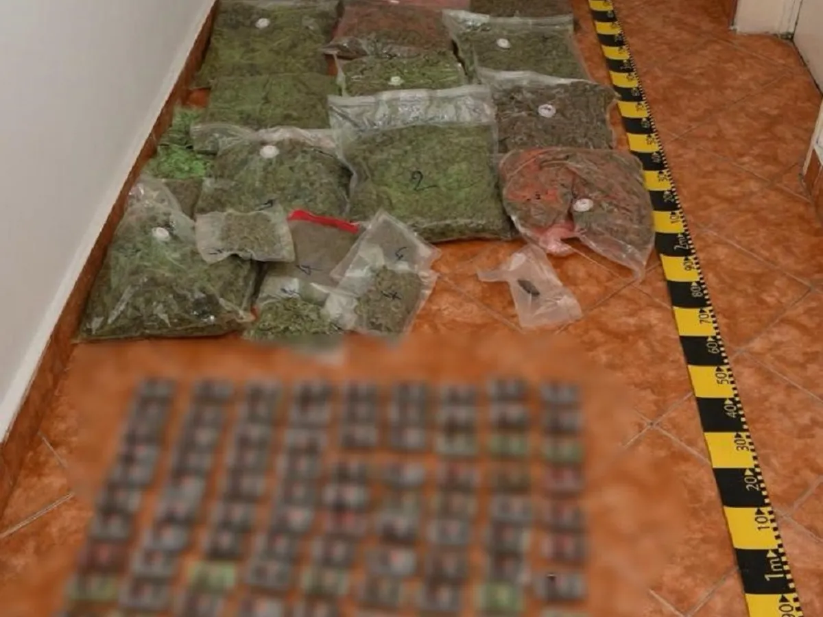 Au fost descoperite și ridicate 40 de kilograme de muguri de canabis (ambalate în 48 de pungi vidate), 12 kilograme de hașis, porționat și ambalat (125 de pachete), aproximativ 120 de grame de cristal, precum și o mașină de numărat bani.