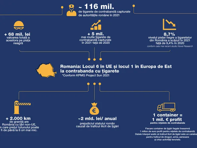Conform rezultatelor prezentate în raportul KPMG Project Sun 2021, România se află pe al șaselea loc între statele membre UE ca nivel al contrabandei cu țigarete și pe primul loc în Europa de Est.