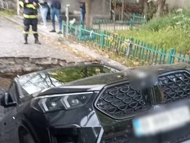 Proprietara autoturismului și băiețelul ei de cinci ani erau lângă vehicul. Copilul a fost la un pas de tragedie, după ce a alunecat și el în craterul format instantaneu.