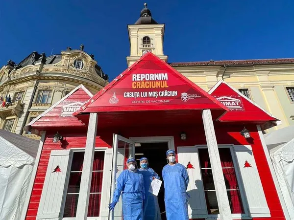 Căsuţa lui Moş Crăciun din Piaţa Mare a Sibiului a devenit centru de vaccinare împotriva COVID-19. Totodată, Primăria Sibiu a amplasat în cele mai vizibile locuri din oraş panouri cu mesajul "Împreună repornim Crăciunul prin vaccinare".