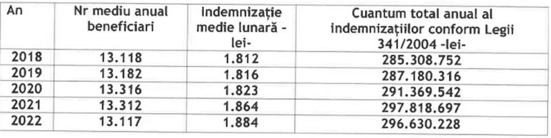 În ultimii cinci ani numărul mediu anual al beneficiarilor de indemnizații conform Legii 341/2004 valoarea medie a indemnizației lunare, precum și cuantumul total al indemnizațiilor plătite, au evoluat după cum urmează: