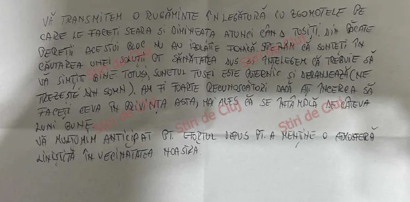 Vă mulțumim anticipat pentru efortul depus pentru a menține o atmosferă liniștită în vecinătatea noastră”, se arată în mesajul lăsat pe ușa vecinului bolnav, conform stiridecluj.ro.