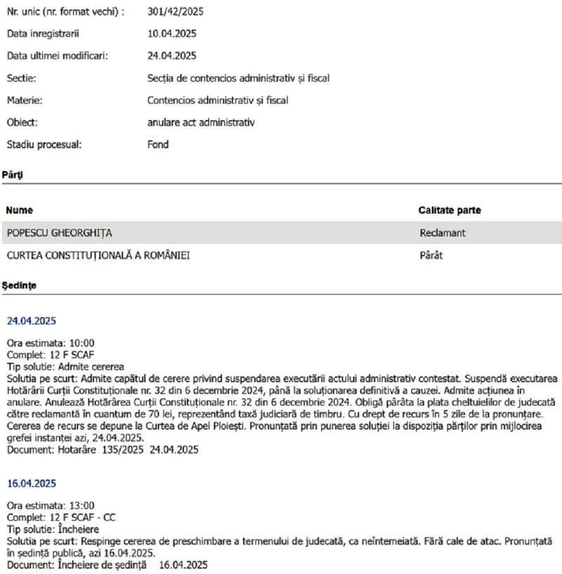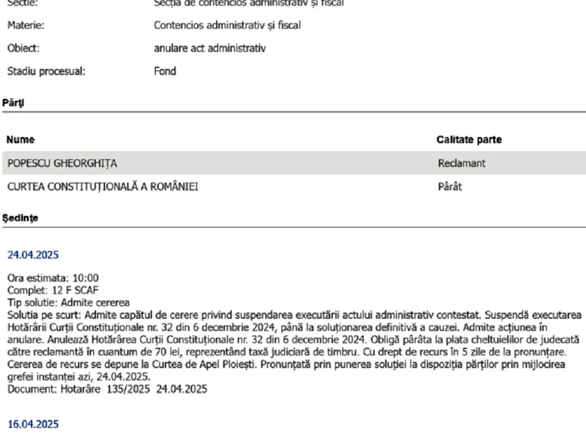 ”Solutia pe scurt: Admite capătul de cerere privind suspendarea executării actului administrativ contestat. Suspendă executarea Hotărârii Curţii Constituţionale nr. 32 din 6 decembrie 2024, până la soluţionarea definitivă a cauzei. Admite acţiunea în anulare. Anulează Hotărârea Curţii Constituţionale nr. 32 din 6 decembrie 2024. Obligă pârâta la plata cheltuielilor de judecată către reclamantă în cuantum de 70 lei, reprezentând taxă judiciară de timbru. Cu drept de recurs în 5 zile de la pronunţare. Cererea de recurs se depune la Curtea de Apel Ploieşti. Pronunţată prin punerea soluţiei la dispoziţia părţilor prin mijlocirea grefei instanţei azi, 24.04.2025”, se arată în decizia Curții de Apel Ploiești.