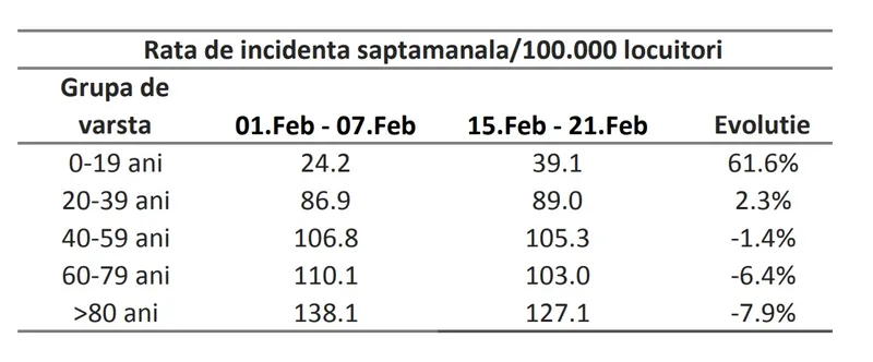 Raportul INSP mai atrage atenția și că „ratele de incidenta săptămânală au crescut majoritar in grupa de vârsta 0-19 de ani si in grupa de vârsta 20-39 de ani. In grupele de vârsta de peste 40 de ani s-au înregistrat scăderi ale ratei de incidenta.