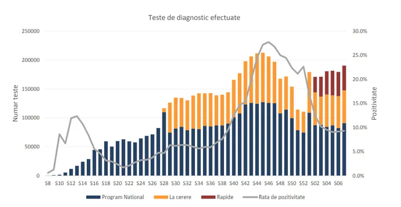 Față de săptămâna 1-7 februarie, rata săptămânala de pozitivitate a probelor a crescut ușor, cu 2.2%.