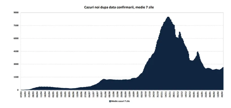 Aceste scăderi au fost ajustate in perioadele imediat următoare, observându-se 7-10 zile de creștere după fiecare minivacanța. Tendința a continuat scăderea in perioada 11 – 22 ianuarie. In ultimele 7 zile evoluția s-a înscris într-un trend ascendent ajungând la o medie de 2.640 cazuri/zi (valoare echivalenta cu cea înregistrata în 20 ianuarie 2021).