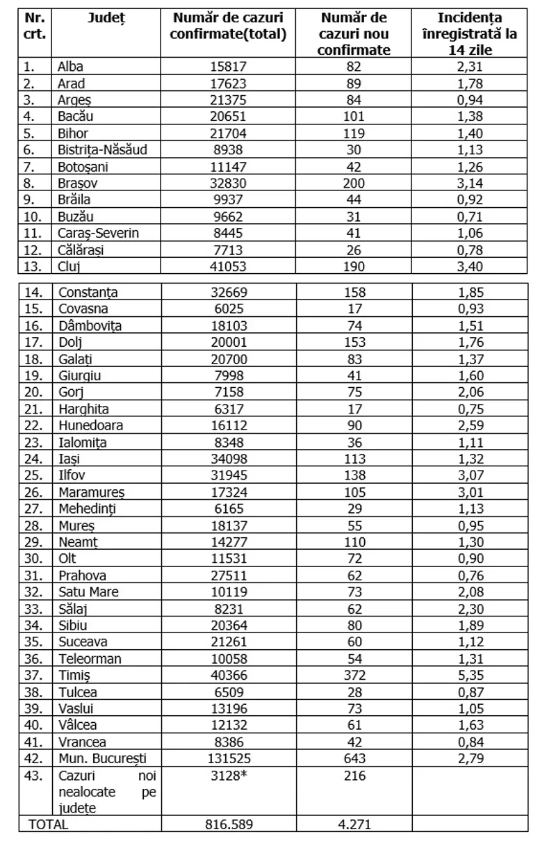 În total, în România au fost confirmate 816.589 de cazuri de infectare cu coronavirus, iar 20.684 persoane diagnosticate cu virusul au murit.