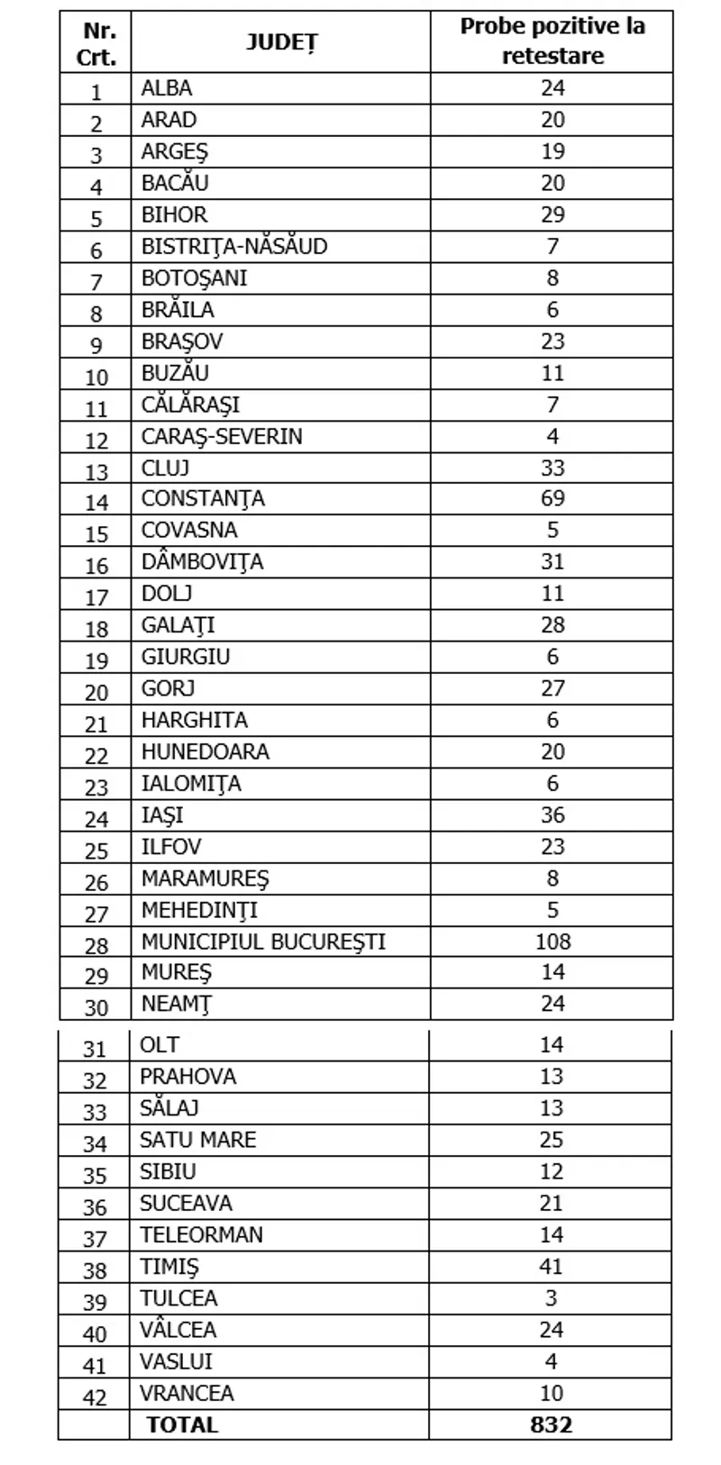 Distinct de cazurile nou confirmate, în urma retestării pacienților care erau deja pozitivi, 832 de persoane au fost reconfirmate pozitiv.