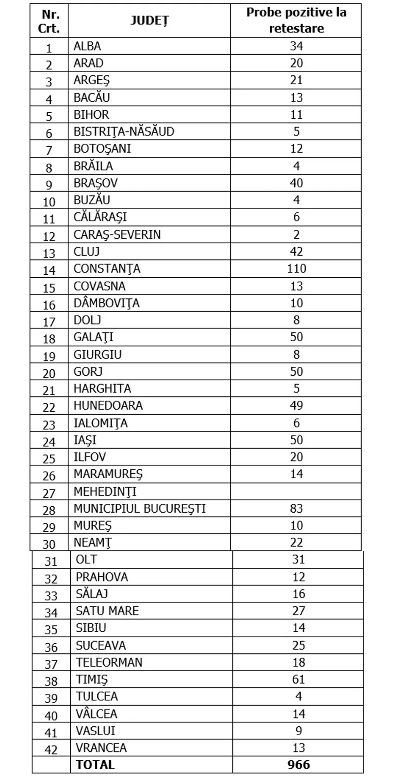 Distinct de cazurile nou confirmate, în urma retestării pacienților care erau deja pozitivi, 966 de persoane au fost reconfirmate pozitiv.