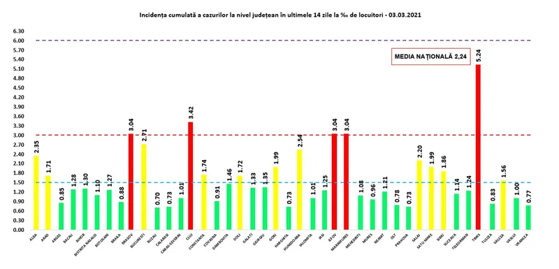 Celelalte patru județe aflate în scenariul roșu sunt: Ilfov și Maramureș - 3,04 la mie, Cluj - 3,42 la mie, Timiș - 5,24 la mie.
