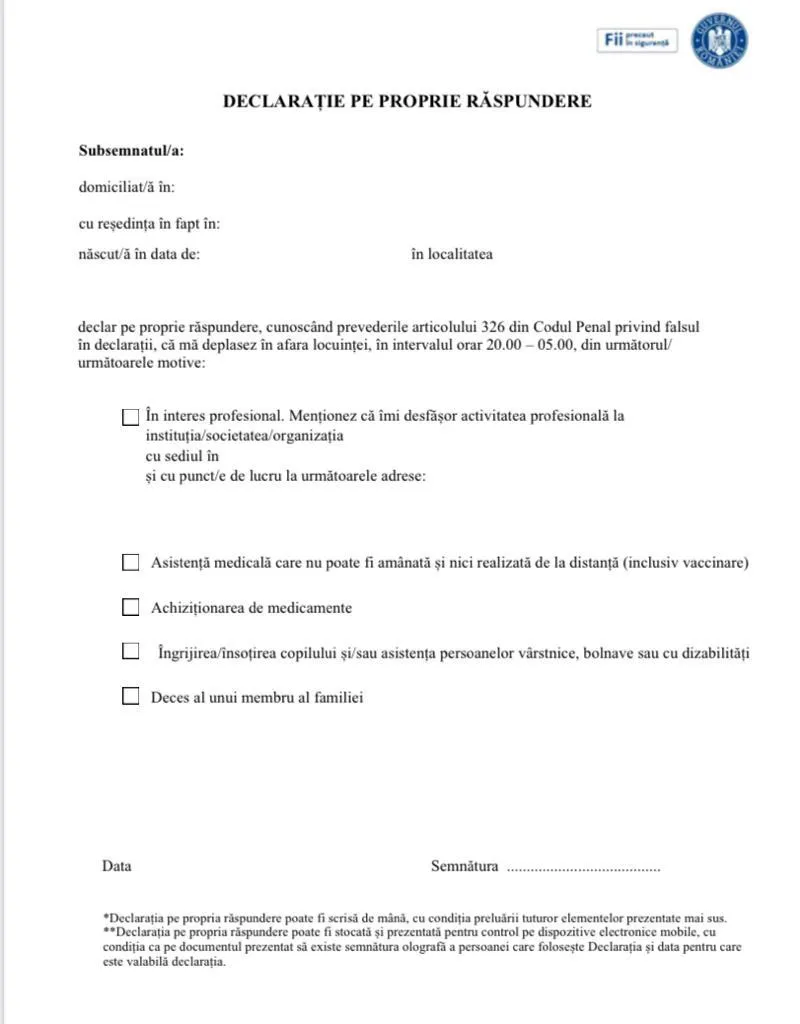 Excepţiile sunt deplasările în interes profesional, pentru asistenţa medicală care nu poate fi amânată, achiziţionarea de medicamente, deplasări în afara localităţilor ale persoanelor care sunt în tranzit, pentru asistenţa persoanelor vârstnice, bolnave sau deces, în aceste cazuri fiind prevăzută obligaţia prezentării autorităţilor abilitate o declaraţie pe proprie răspundere, completată în prealabil.