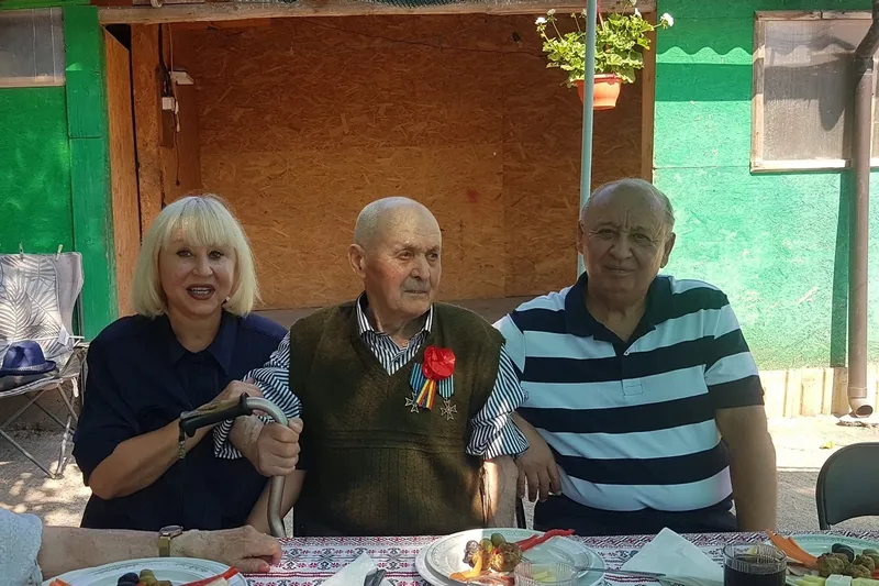Mihai Ardeleanu, în 2023, încadrat de cei doi copii ai săi, cu ocazia sărbătoririi a 100 de ani de viață - Foto: monitoruldevaslui.ro