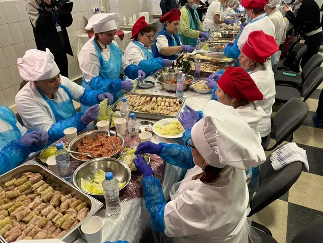 În oale uriașe, o primă serie de sarmale deja clocotea pe foc, în timp ce aburii ridicau aroma ce pătrundea în fiecare colț al încăperii. În jur, bucătari și zeci de voluntari lucrau neobosiți, în mănuși, bonete și măști, modelând sarmale cu atenție.