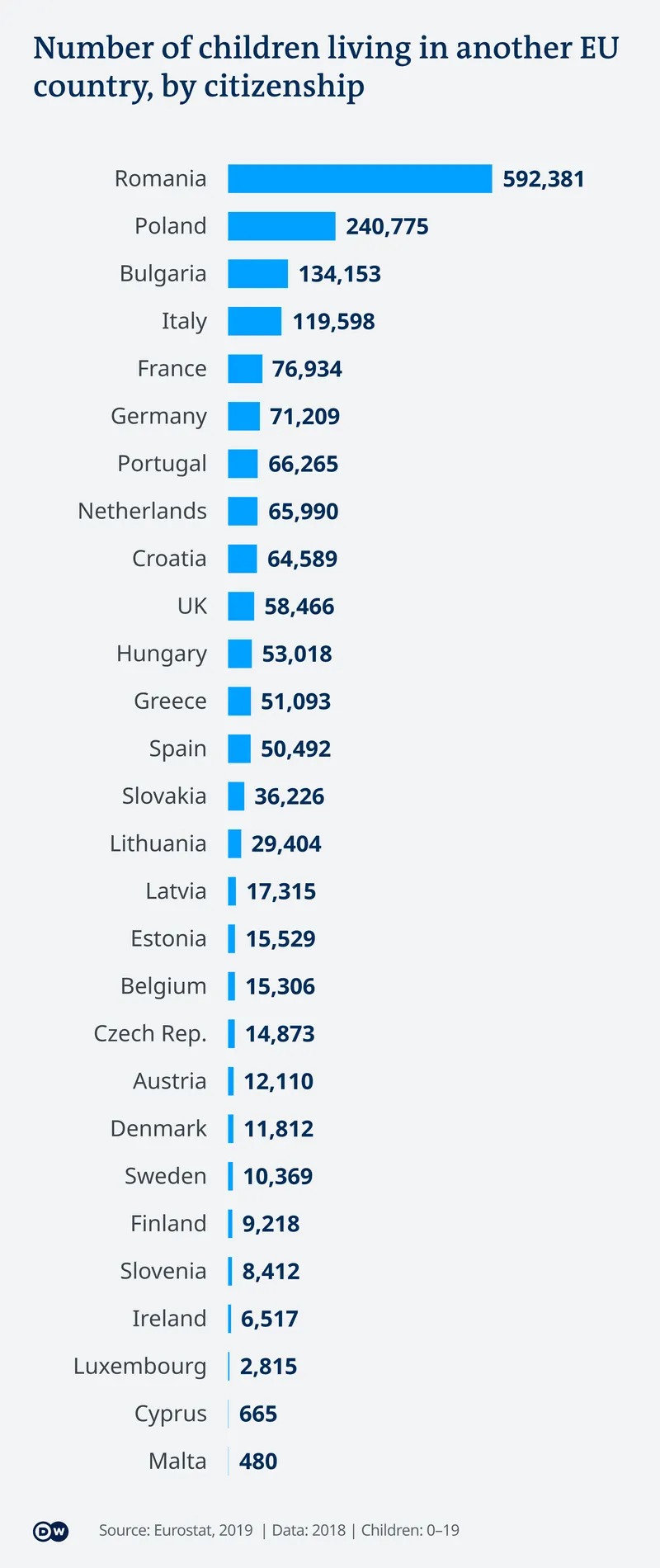 În Uniunea Europeană, în jur de 6,9 milioane de copii trăiesc în altă țară decât cea a cărei cetățenie o dețin. România conduce lista țărilor de origine a persoanelor sub 20 de ani care locuiesc în alte state ale UE.