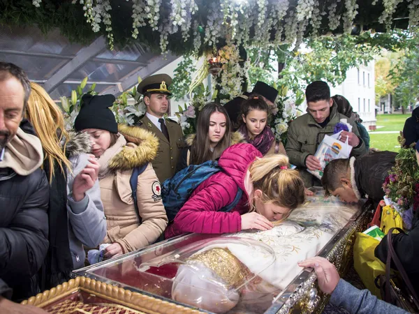 Pelerinii prezenţi la eveniment sunt bucuroşi că, în sfârşit, a început în mod oficial pelerinajul la moaştele Sfintei Cuvioase Parascheva. Nu de mult au fost scoase din catedrală şi puse aici, la baldachinul împodobit cu flori.