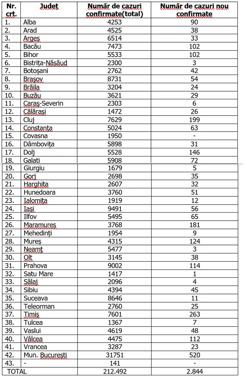 În urma testelor efectuate la nivel național, față de ultima raportare, au fost înregistrate 2.844 cazuri noi de persoane infectate cu SARS – CoV - 2 (COVID – 19), acestea fiind cazuri care nu au mai avut anterior un test pozitiv.