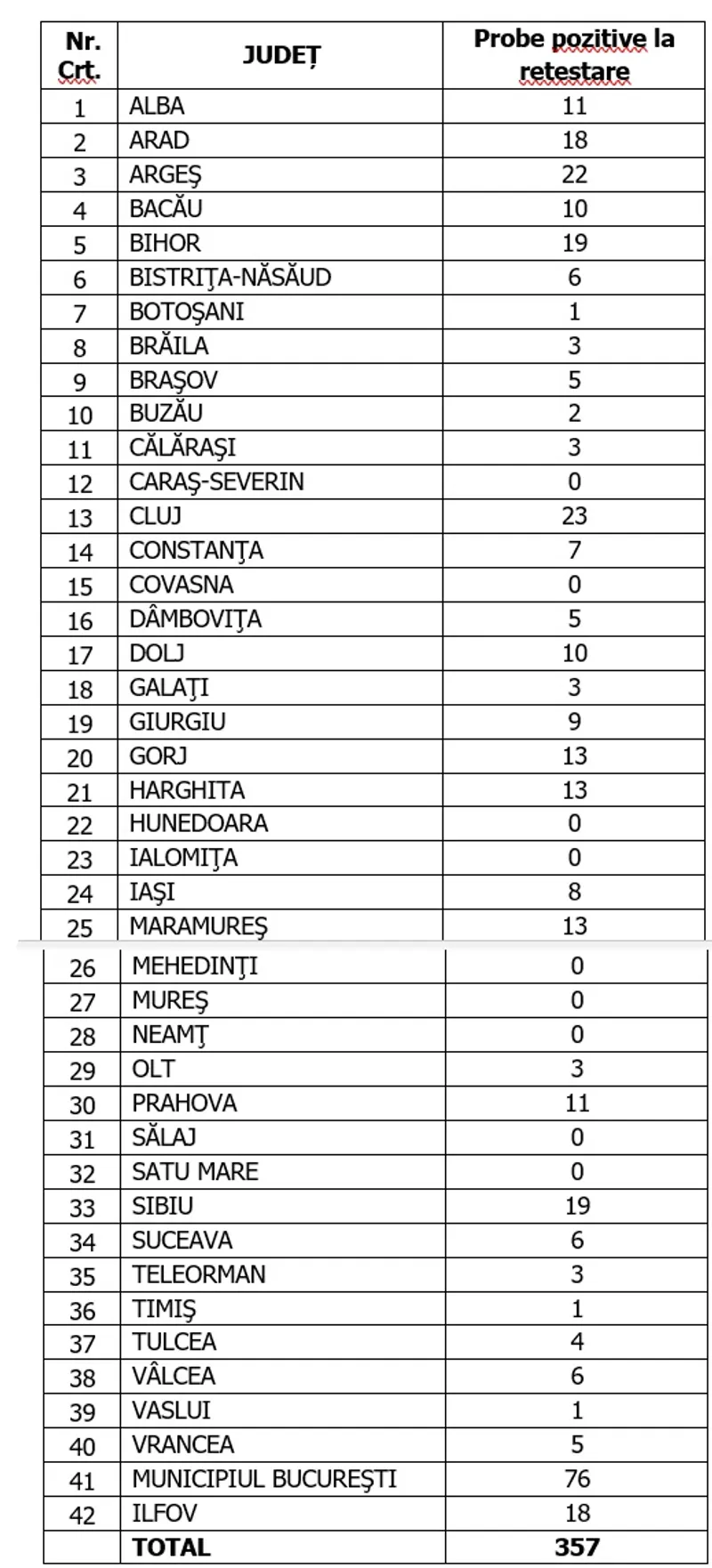 Distinct de cazurile nou confirmate, în urma retestării pacienților care erau deja pozitivi, 357 de persoane au fost reconfirmate pozitiv.