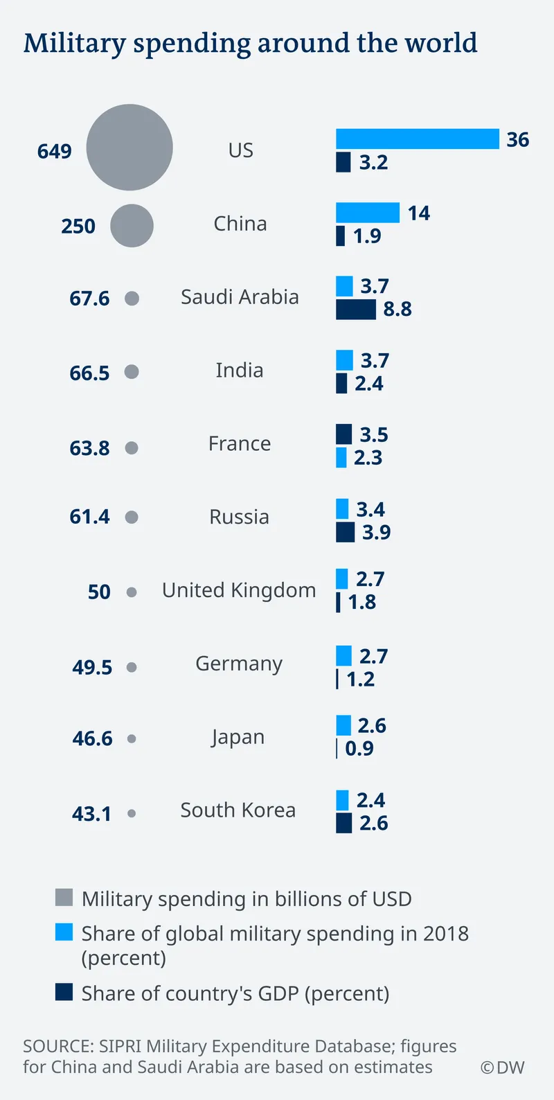 SUA conduce clasamentul statelor cu cele mai ridicate cheltuieli pentru apărare, înregistrând o creştere de 4,6% faţă de 2017. Cercetătorul Nan Tian de la SIPRI a declarat pentru DW că e vorba de prima creştere de aceste dimensiuni din „ultimii şapte ani" şi că se estimează o creştere considerabilă în deceniile următoare.