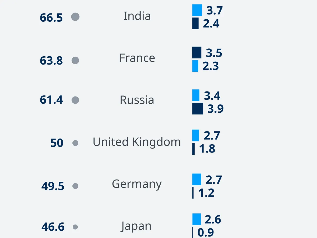 Rusia, una dintre ţările cu cele mai ridicate cheltuieli militare, a scăzut de pe locul patru pe locul şase la nivel mondial în clasamentul SIPRI pe 2018. „E vorba de o scădere de 3,5 la sută în 2018, la care s-a ajuns însă din cauza inflaţiei (din Rusia)", spune Nan Tian de la SIPRI. „La nivel nominal, cheltuielile au rămas constante între 2017 şi 2018."