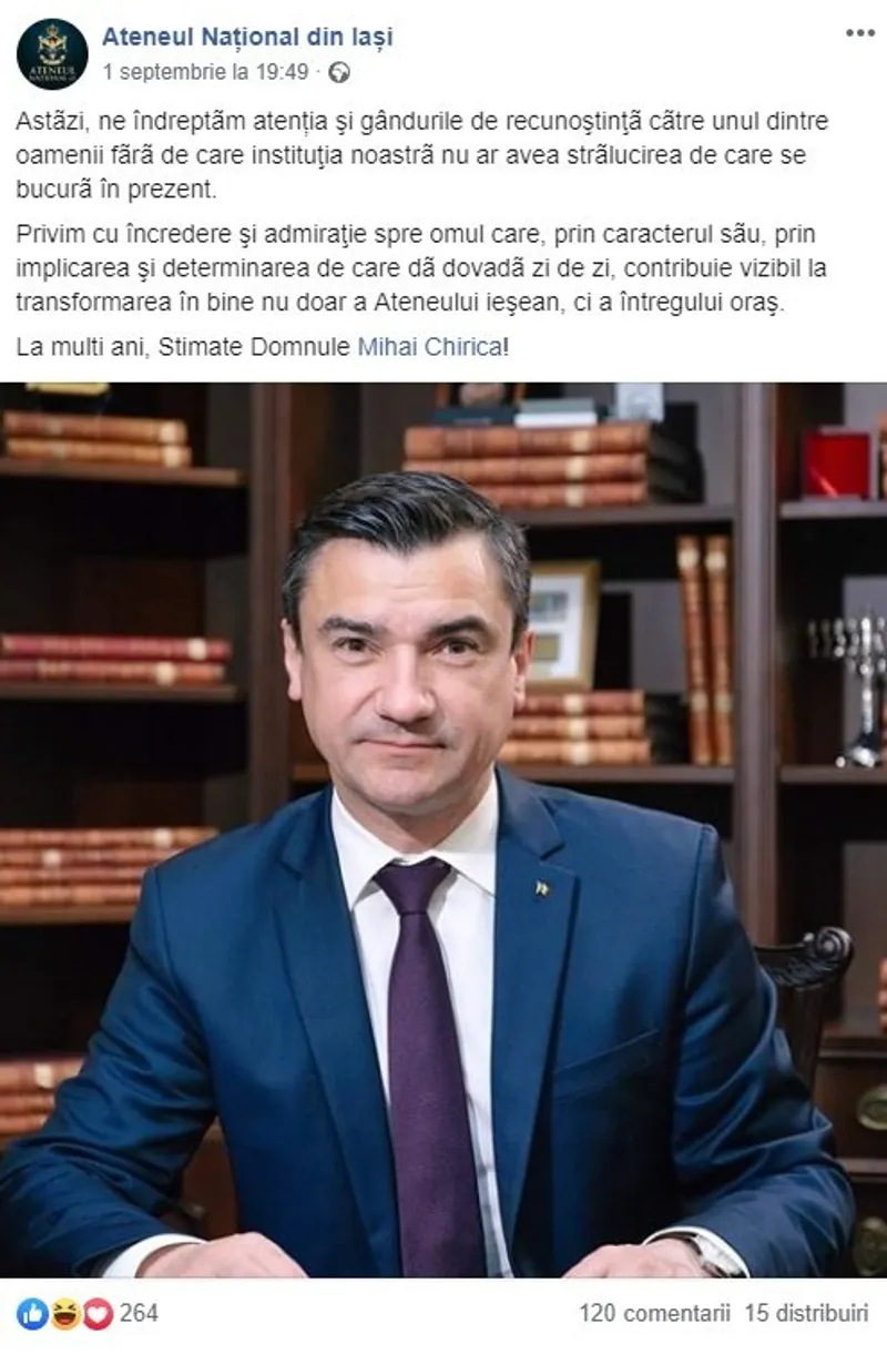 Ziua de naștere a primarului de Iași, Mihai Chirica, ar fi trecut neobservată în spațiul public dacă, pe finalul aniversării, în seara zilei de 1 septembrie, cineva de la Ateneul Național din Iași nu ar fi postat următorul mesaj, tăguindu-l pe edil: