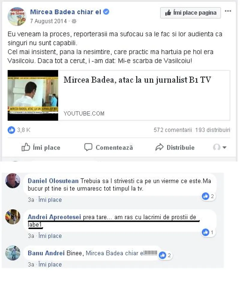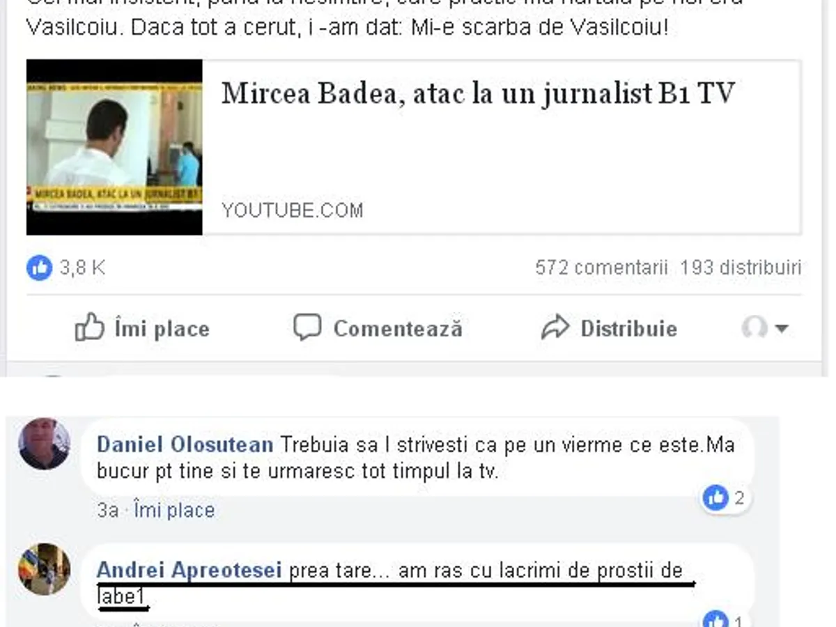 Însuși Apreotesei este un postac violent – pe pagina de Facebook a realizatorului TV lui Mircea Badea, el a scris că ”am râs cu lacrimi despre proştii de labe1“.